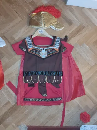 Disfraz de romano para niños, ideal para fiestas o juegos. - Casco dorado con penacho rojo. - Túnica marrón y roja con detalles. - Capa roja.