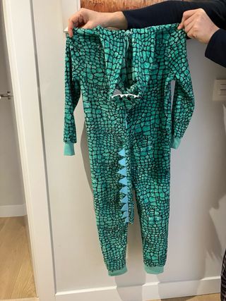 Disfraz de dinosaurio para niños, talla 6-8 años. Perfecto para fiestas o para jugar. - Diseño de dinosaurio en color verde con escamas. - Incluye capucha con ojos y cresta. - Cierre de cremallera frontal. - Material suave y cómodo.
