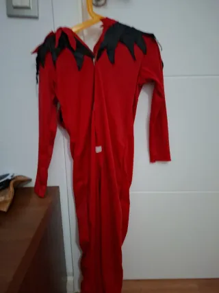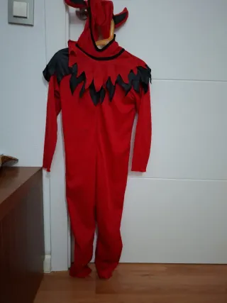 Disfraz de demonio para niños, de color rojo y con detalles negros. - Diseño con capucha y cuernos. - Mangas largas y pantalón. - Cuello con picos negros. Talla 7