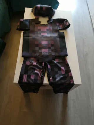 Disfraz de armadura de diamante de Minecraft. Ideal para fiestas temáticas o para jugar. Para 130 - 135 de altura. Niño de 8-9 años. - Diseño pixelado característico de Minecraft. - Incluye parte superior y pantalón. - Estampado en tonos morados y negros.