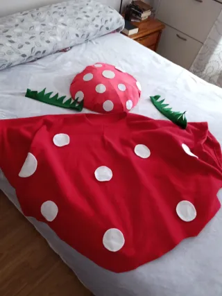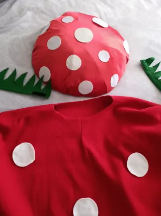 Disfraz divertido de seta, perfecto para fiestas o Carnaval. - Diseño rojo con puntos blancos. - Incluye gorro y capa. - Adornos verdes.