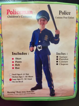 Disfraz de policía para niño. Aunque pone talla de 11 a 14 no vale para más de 10/11 años. Pongo medidas para comprobarlo: Medidas pantalón --> cintura 25 cmts, largo pierna 75 cmts, Medidas camisa --> largo manga 45, largo total 49 , ancho 38 cmts. Va todo lo q se ve en la foto: camisa, pantalón, cinturón, gorra, porra y esposas/llave.