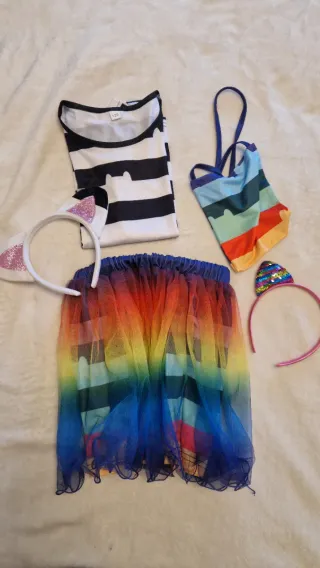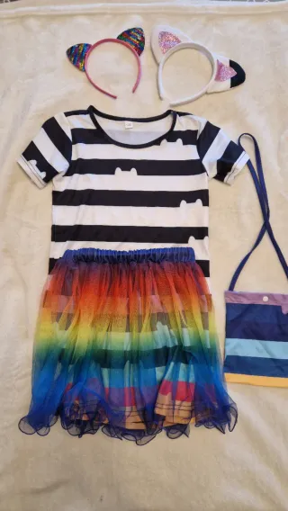 Conjunto de disfraz inspirado en Gabby Dollhouse. - Diadema con orejas de gato (una con lentejuelas multicolor, otra con purpurina rosa). - Camiseta de manga corta a rayas blancas y negras con siluetas de gatitos. - Falda tutú de tul con degradado de colores arcoíris. - Bolso pequeño a juego con rayas de colores y cierre de botón.
