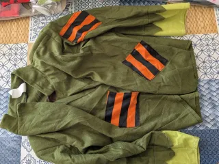 Incluye camiseta, pantalón y goma con plumas para la cabeza. La tela es como de ante, muy bonita. Tiene unos detalles bordados en mangas y bajo del pantalón que están un poquito deshilachados. En la goma de la diadema pone Miguel. El cierre de la camiseta es con veleros por detrás y el pantalón se ajusta con goma en la cintura.