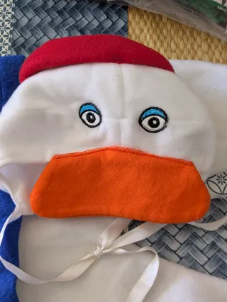 Disfraz de Pato Donald para bebé, perfecto para fiestas o para disfrazarse. - Diseño blanco con detalles de ojos azules y pico naranja. - Incluye gorro con orejas y lazo blanco para atar. - Material suave y cómodo.