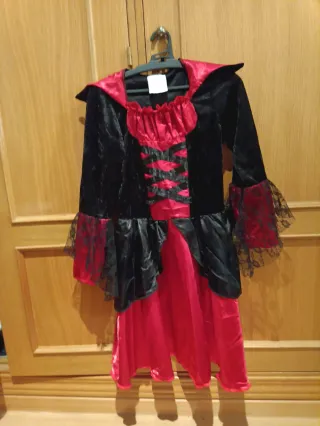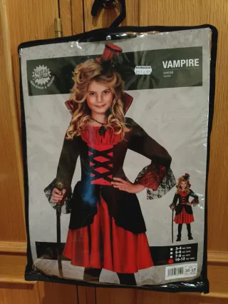 Disfraz de vampira para niña, ideal para fiestas de disfraces o Halloween. - Incluye vestido con detalles rojos y negros. - Cuello de vampiro. - Talla 10-12 años.