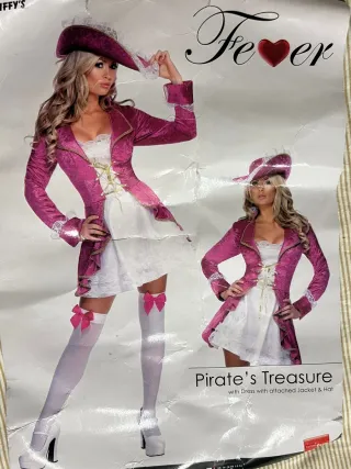 La talla va de una L a una XL ya que la tela da de si bastante. Lo compré en una tienda de disfraces muy conocida en Barcelona . Traje de pirata para chica, ideal para fiestas de disfraces. Incluye , vestido, medias y sombrero. El conjunto está en muy buen estado y luce precioso. - Chaqueta de terciopelo rosa con detalles dorados. - Vestido blanco con detalles de encaje. - Medias blancas con lazos rosas. - Sombrero rosa con calavera.