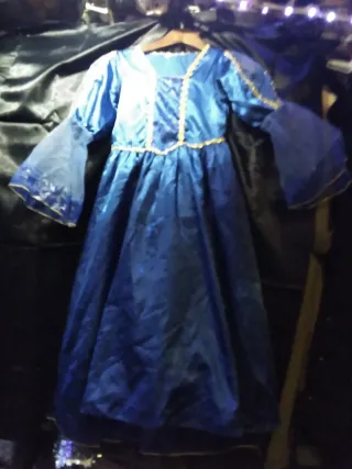 Este disfraz de princesa es ideal para eventos especiales o juegos. - Mangas acampanadas con detalles. - Adornos dorados en el escote y cintura. - Falda larga y fluida.