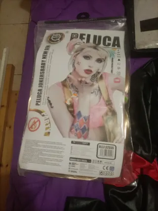 Disfraz inspirado en Harley Quinn con un diseño llamativo. Talla 5-6, pero podría ponerse a una niña de 7 años. - Incluye varias piezas para un look completo. - Patrón de rombos característico. - Combinación de colores rojo y negro. Incluye complentos: falda, diadema y peluca