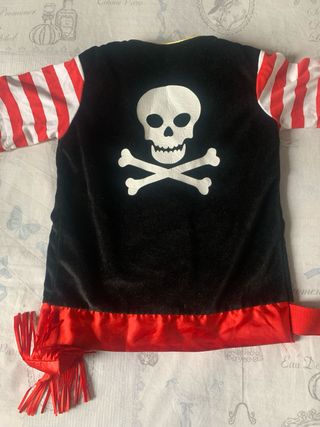 Chaquet Disfraz de pirata para niño/a 4 a 6 años - Chaleco negro con detalles dorados. - Mangas y forro a rayas rojas y blancas. - Botones dorados con calavera. - Bolsillos con estampado de calavera. - Cinturón o fajín rojo con flecos.