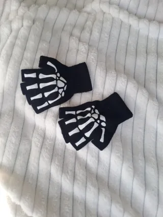 Par de guantes sin dedos con diseño de esqueleto. - Diseño de huesos en blanco. - Tejido negro.