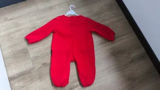 Disfraz de conejito suave y tierno, perfecto para los más pequeños. - Talla: 12 a 24 meses. - Color: Gris con detalles blancos y rojos. - Material: Peluche. - Capucha con orejas y pompón rojo. - Detalle de lazo rojo en el pecho.