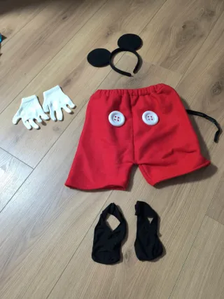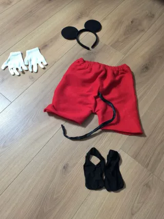 Conjunto de disfraz de Mickey Mouse para niños. - Incluye diadema con orejas. - Pantalón rojo con botones blancos. - Par de guantes blancos. - Par de cubre zapatos negros. De regalo gorro negro con orejas ideal para el frío