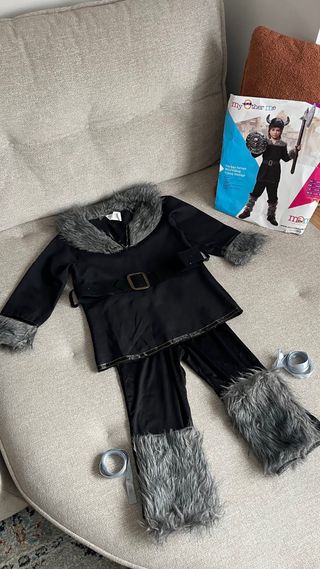 Disfraz de vikingo para niño, talla 3-4 años. Incluye túnica, cinturón, pantalón, gorro vikingo y calentadores. - Túnica negra con cuello y puños de pelo sintético gris. - Cinturón negro con hebilla. - Pantalones negros con cubrebotas de pelo sintético gris.