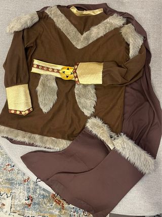 Disfraz de estilo vikingo con detalles de pelo sintético. - Color marrón principal. - Adornos de pelo sintético en el pecho y los hombros. - Puños y cuello con detalles dorados algo desgastados