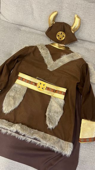 Disfraz de vikinga para niña, perfecto para fiestas o Halloween. Talla 10/12 años, pero vale también para niños desde 7 años. - Incluye casco con cuernos dorados. - Túnica marrón con detalles de pelo sintético. - Cinturón dorado. - Brazaletes dorados. - Capa. - Botas altas marrones con pelo sintético.