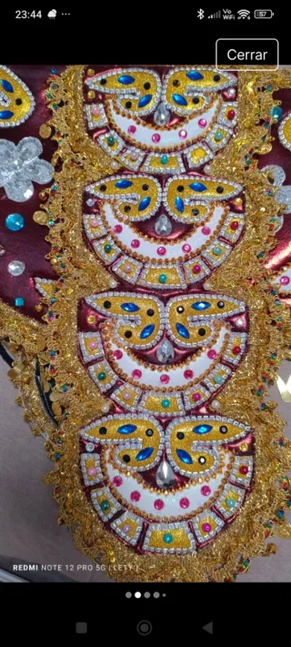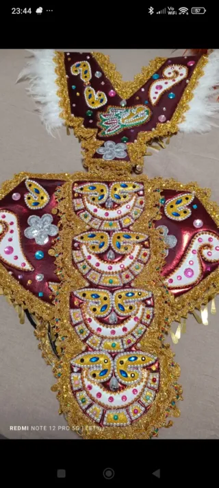 Este disfraz de carnaval es una pieza llamativa y elaborada. - Diseño intrincado con detalles bordados. - Adornos de pedrería y lentejuelas. - Incorpora plumas blancas en la parte superior. - Bordes dorados con acabado brillante.