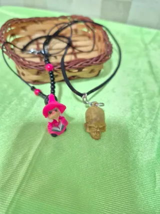 Conjunto de collares de fantasía para niños,como accesorios disfraz. - Colgante de bruja fucsia con sombrero rosa. - Colgante de calavera de goma. - Cuentas negras y rosas. Precio por los dos.