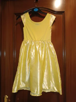 Disfraz infantil inspirado en Bella de Disney. - Talla 3-4 años - Vestido amarillo brillante. - Detalle de medallón en el pecho. - Adornos dorados en la falda.