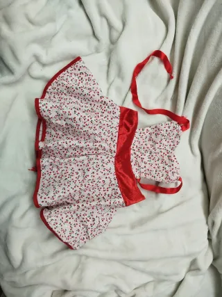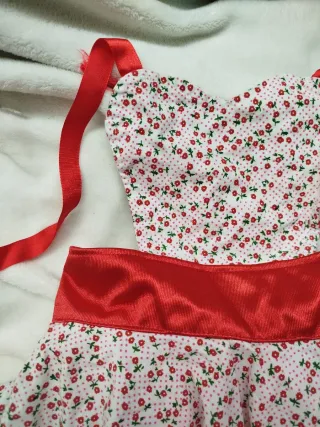 Este disfraz para niña tiene un estampado floral con detalles en rojo. - Talla aproximada para 3-7 años. Puede servir para Caperucita roja,ratita presumida,tarta de fresa,campesina,cocinera vintage ...etc RECOGIDA A DOMICILIO EN CERDANYOLA