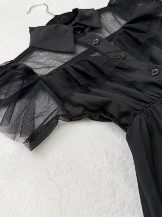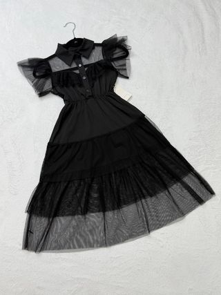 Vestido negro inspirado en Miércoles Addams, con detalles de tul, cuello camisero, mangas cortas abullonadas de tul, cuerpo con botones y falda con volantes y capas de tul. frozen#elsa#spiderman#batman#superman#avengers#policia#bombero#pirata#mago#harrypotter#bruja#vampiro#fantasma#esqueleto#dinosaurio#animal#payaso#angel#diablo#zombie#carnavalcolegio#disfrazfamilia#accesoriosdisfraz#mascara#peluca#capa#envio#enviorapido#entregamano#barcelona#oferta#chollo#gangas#liquidacion