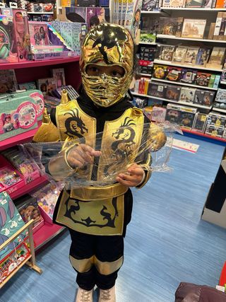 Disfraz de ninja con un llamativo diseño en dorado y negro. - Máscara facial dorada. - Chaleco con detalles de dragones. - Pantalones negros con detalles dorados. Por 8-9 anos ( 140cm o mas )