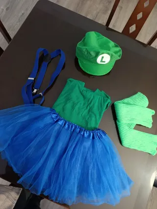 Conjunto de disfraz inspirado en Luigi. - Gorra verde con el logo L. - Camiseta verde talla M - Tutú azul. - Tirantes azules. - Calentadores verdes.
