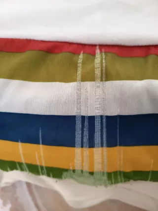 Disfraz de Chucky para niños, talla 7-9 años. Incluye camiseta de rayas y peto. Sólo ha tenido un uso. - Camiseta de manga larga con cuello rojo y rayas de colores (rojo, naranja, amarillo, verde, azul, morado). - Peto de tela vaquera azul con tirantes y dos botones rojos. - Puños y tobillos de la camiseta y el peto con estampado de rayas de colores.