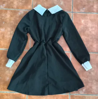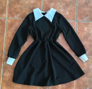 Disfraz inspirado en Miércoles Addams, perfecto para fiestas temáticas o Halloween. Este vestido negro con cuello y puños blancos es ideal para recrear el icónico look. - Vestido negro. - Cuello blanco. - Puños blancos.