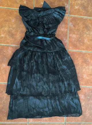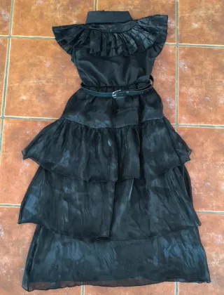 Disfraz inspirado en Miércoles Addams, de color negro. Ideal para fiestas temáticas o Halloween. - Vestido largo con volantes. - Cuello camisero. - Cinturón negro incluido. - Diseño de varias capas en la falda.