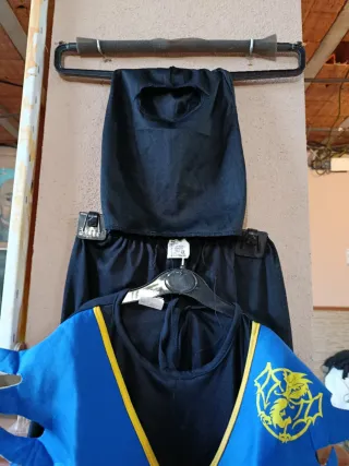 Disfraz de ninja para niño, ideal para fiestas o juegos. - Incluye pasamontañas negra. - Traje azul con detalles amarillos y dragón, camisa, pantalones y cinturón,talla 4