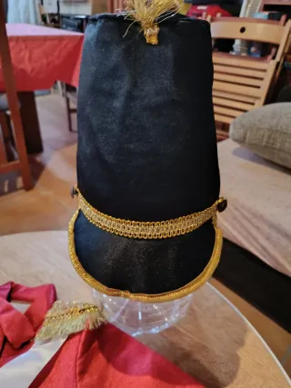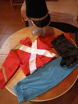 Disfraz de soldadito de plomo para niños. Incluye chaqueta, pantalón, botas y sombrero. Talla 2-3 años - Chaqueta roja con detalles dorados y banda blanca. - Pantalón azul. - Sombrero negro con adorno dorado. Botas negras Diseño propio