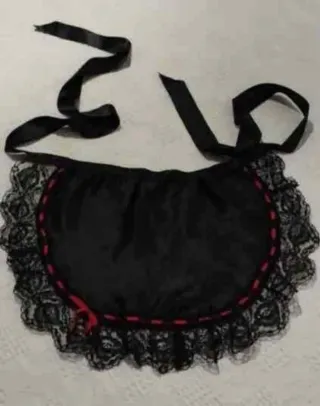 Delantal de raso con detalles de puntilla de encaje y ribete. - Ribete en color rojo. - Lazos largos negros para atar. - Medidas 45×36 cm. Ideal para traje regional o disfraz.