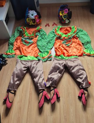 Disfraz temática andaluza de segunda mano. Totalmente hecho a mano para los carnavales de Getafe. Las piernas se ponen atadas a la cintura y llevaba un balcón que se tiró. Gorro de goma Eva. Precio negociable