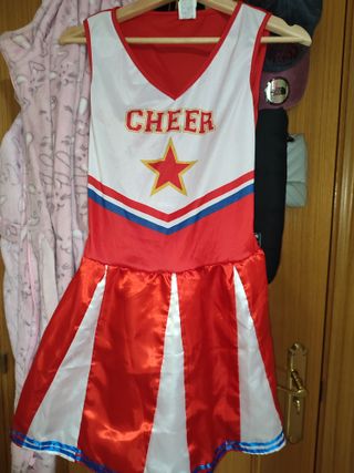 Conjunto de animadora con pompones rosa talla S - Palabra CHEERS en el torso.