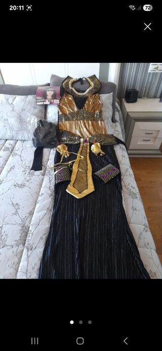 Preciosa vestimenta de Cleopatra, ideal para fiestas de disfraces. Incluye vestido, collar, cinturón y brazaletes. El conjunto está en excelentes condiciones y luce imponente. - Vestido largo con detalles dorados. - Collar y cinturón con pedrería. - 2 brazaletes a juego. - Peluca