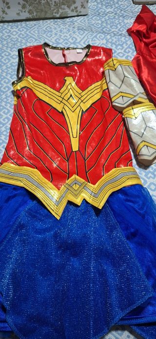 Conjunto de disfraz inspirado en Wonder Woman. Incluye vestido, capa y accesorios. - Vestido con detalles dorados y falda de tul. - Capa roja brillante. - Brazaletes y tiara a juego.