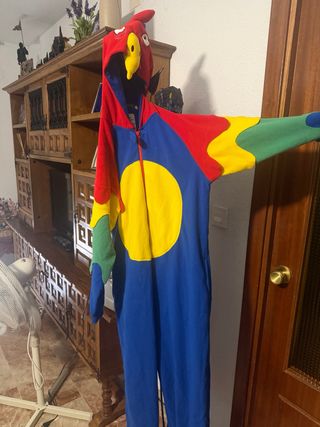 Disfraz de pájaro con un diseño colorido y divertido. - Talla S (equivalente a 34-36 / 44-46). - Predominan los colores azul y rojo, con detalles en amarillo y verde.