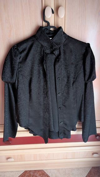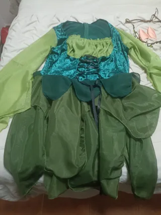 De calidad y como recién abierto. Lo compré el año pasado para carnaval pero no me llegó a tiempo, así que improvisé de forma casera un disfraz de Elphaba como pude y este, cuando llegó días después, ha sido guardado nada más llegar, por lo que nunca se ha usado para nada. El sombrero no viene incluido (eso sí me lo quiero quedar de recuerdo) - Diseño con estampado floral. - Mangas abullonadas. - Cuello alto. - Cierre de botones.