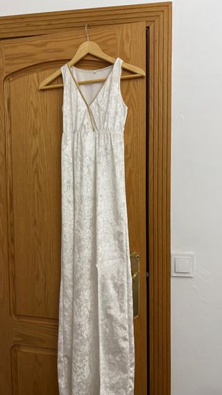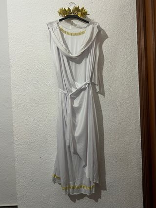 Disfraz de inspiración romana, ideal para fiestas temáticas o representaciones. - Túnica blanca larga con detalles dorados. - Cinturón a juego. - Corona dorada tipo laurel.