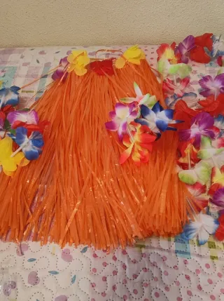 Disfraz de hawaiana para niña, ideal para fiestas temáticas o carnavales. Incluye falda, collar, pulsera y corona de flores - Falda de hierba naranja. - Flores de colores variados.