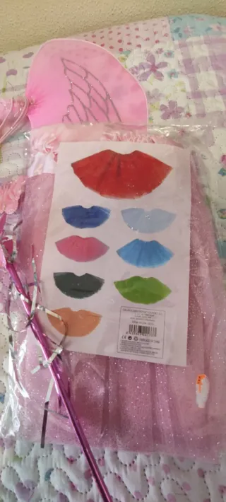 Conjunto de disfraz de hada para niña en color rosa, ideal para edades de 3 a 6 años. Incluye varios accesorios para completar el look. - Alas de hada con mariposas. - Varita mágica. - Diadema con plumas -Tutú