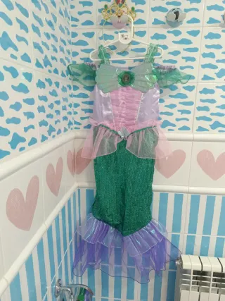 Disfraz de la Princesa Ariel, ideal para fiestas o juegos. - Parte superior en color lila con detalles de volantes verdes. - Falda con lentejuelas verdes y volantes morados. - Incluye diadema con corona. - Incluye la caja original en forma de corazón