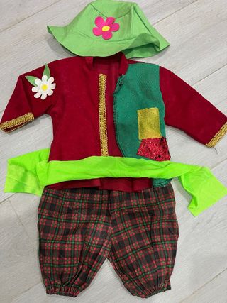 Disfraz de enanito para niños. - Gorro rojo con detalles naranjas. - Cuerpo verde con cuello de colores. - Cinturón verde con hebilla naranja. - Pantalón rojo. Talla de 7 a 12 meses.