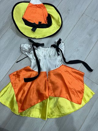 Disfraz de brujita con temática de caramelo. - Talla 4-6 años. - Incluye sombrero. - Diseño de tres colores: blanco, naranja y amarillo.