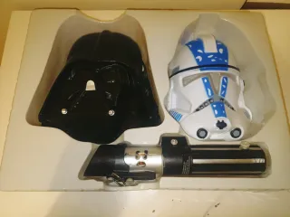 Set de disfraz infantil de Star Wars que incluye accesorios. - Máscara y disfraz de Darth Vader. - Máscara de Stormtrooper. - Sable de luz.