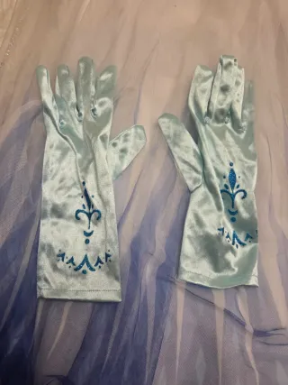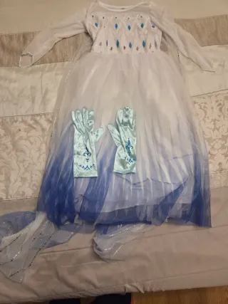 Disfraz de Elsa de Frozen para niña de 7 años. Incluye vestido y guantes. - Vestido blanco con detalles brillantes y capa. - Guantes celestes con diseño, tienen una pequeña mancha. - Falda con degradado azul.