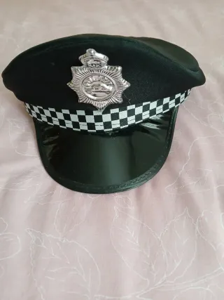 Gorra de policía, ideal para disfraces. Cuenta con un diseño clásico y distintivo. - Insignia plateada con corona y escudo. - Banda a cuadros blancos y negros.