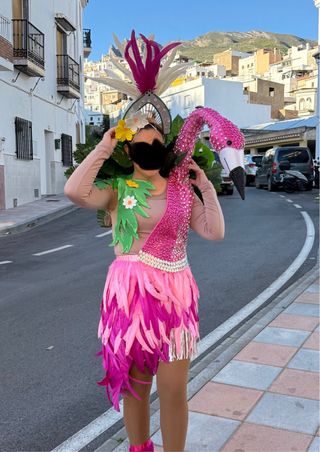 Disfraz de flamenco con detalles de brillantes. Disponemos de 5 disfraces. Todo el flamenco esta pegado con perlas una a una. Diferentes tallas. - Diseño llamativo con plumas. - Adornos brillantes en el corpiño. - Incluye tocado a juego. - Incluye la armadura de hierro -Incluye el centro de hojas verdes -Incluye la camiseta térmica con los adornos -Incluye la falda entera de plumas Solo ha tenido un día de uso.