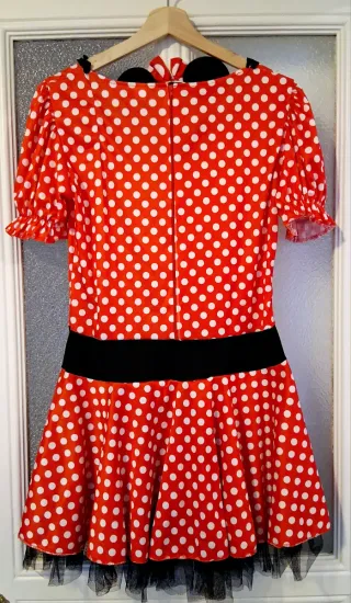 Disfraz de Minnie Mouse para adulto, perfecto para fiestas temáticas o de disfraces. - Diseño de lunares rojos y blancos. - Incluye diadema con orejas y lazo. - Falda con volantes de tul negro. Tiene algún pespunte en la espalda y la cintura pero apenas se ve.